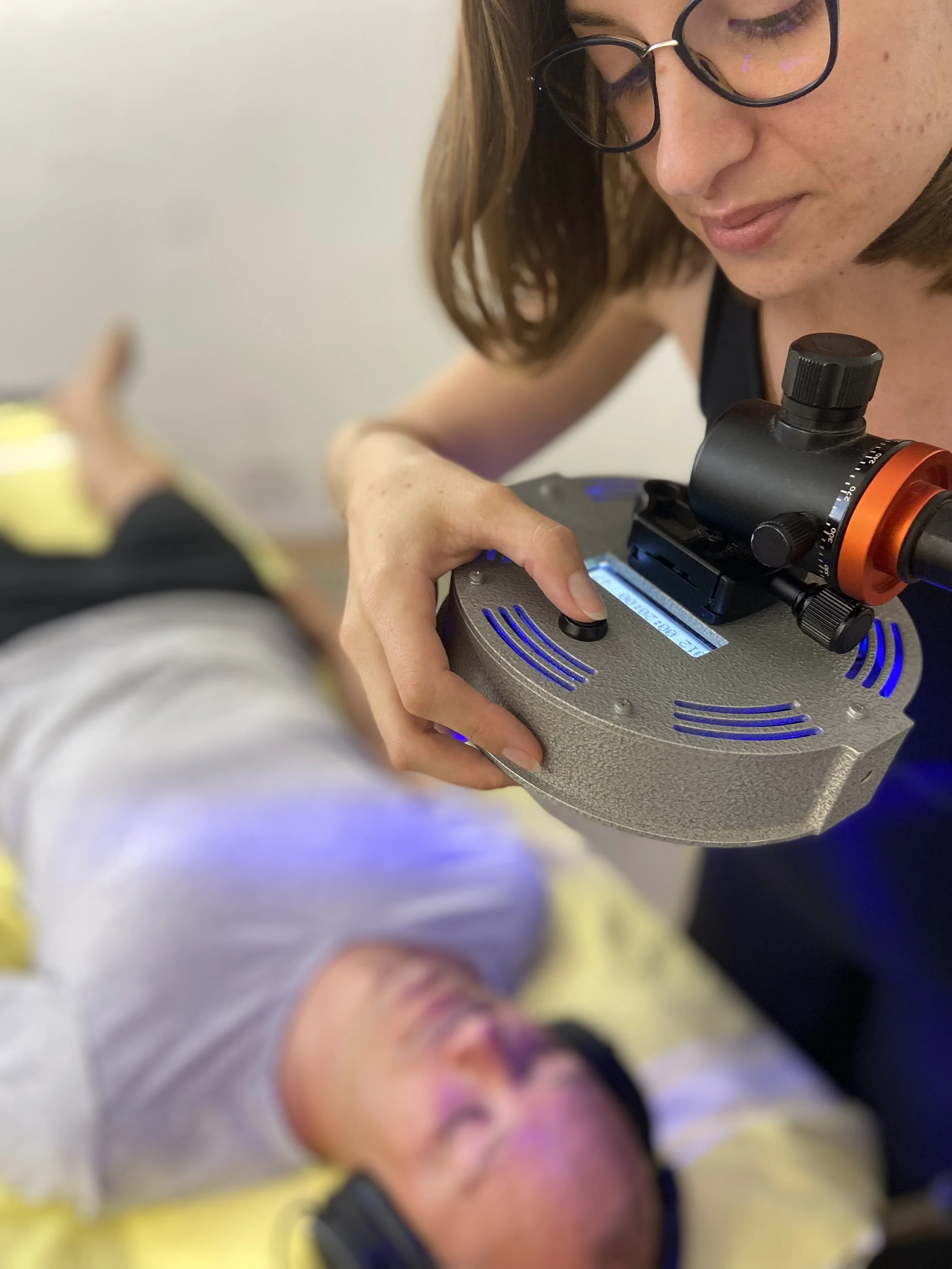 Confortablement allongé sur une table de massage avec les yeux fermés sous la lampe, un test de quelques minutes sera effectué pour ajuster l’intensité lumineuse.